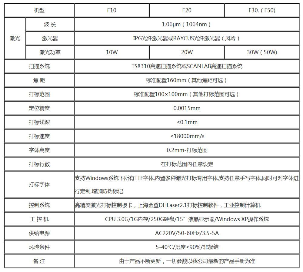 F系列光纤激光打标机是我公司*研发的新一代静态光纤免维护激光打标机。该机型具有以下性能特点: